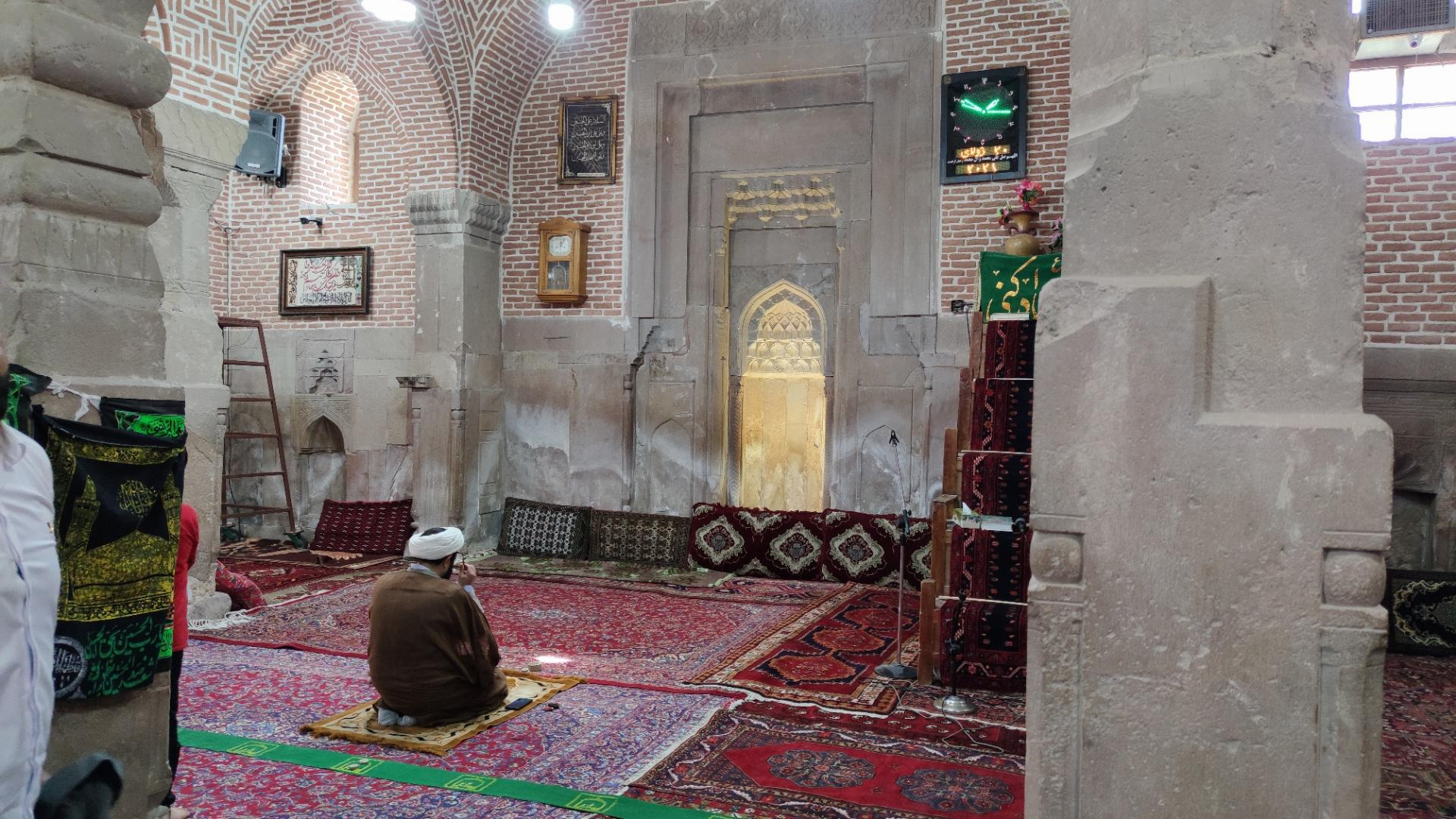 İbadət salonunda sadə müqərnəslərlə bəzədilmiş əsas mehrab var. Mehrab bütöv bir daşdan yonulmuşdur və bu baxımdan çox böyük bədii və tarixi dəyərə malikdir. Əsas mehrabın iki tərəfində iki kiçik mehrab da görünür. Bu iki mehrab ehtimal ki, bəzək kimi hazırlanmış və camaat namazının qılınmasında istifadə edilməmişdir. Məscidin bəzi hissələrinin tikintisində kərpicdən istifadə edilməsi, məscidin əsas və daş hissəsinin daha qədim olması nəzəriyyəsini gücləndirir.